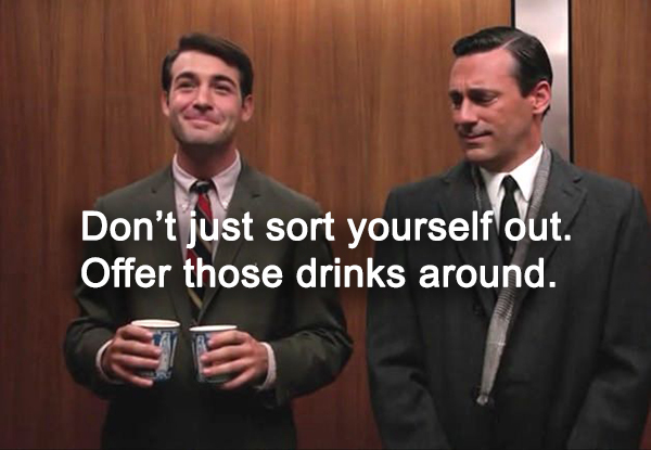 - Don’t be stingy with the drinks rounds. We’ve all noticed those people who never offer to make anyone a drink at work but always say yes if offered. Get that good energy flowing by offering to make a brew or get everyone in your team a drink of water.