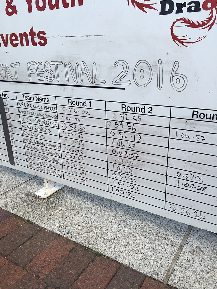 Racing took part of a beautiful sunny day, along the whole length of Ontario Dock, in Salford Quays, which is around 180 meters. 25 teams took part with each being given a minimum of three timed races the single fastest time only counting towards Grand Final qualification.